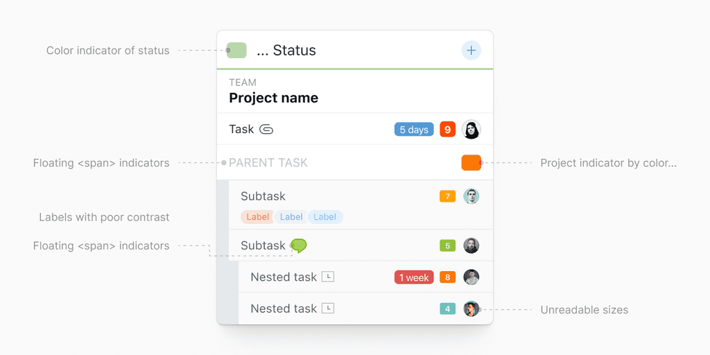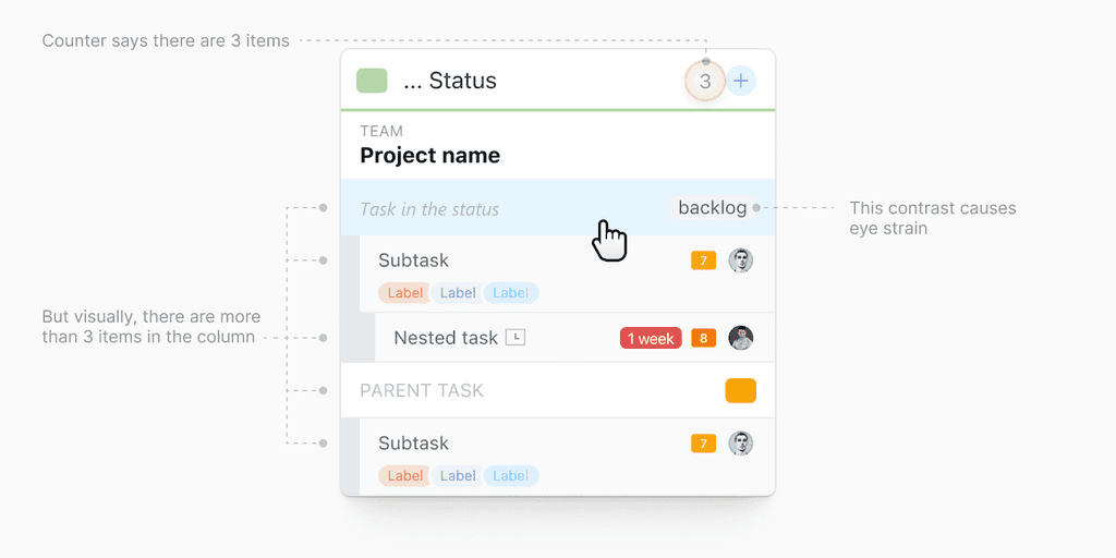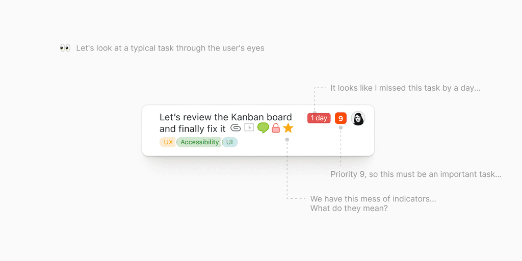Floating indicators. Most indicators appeared as small text elements after the task name. Users had to search for them manually, for example, to find a new comment.